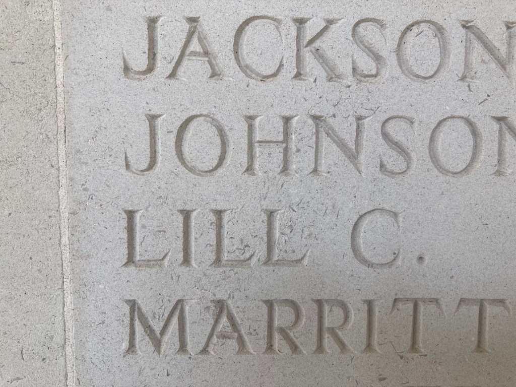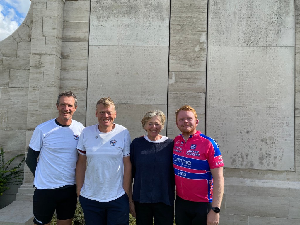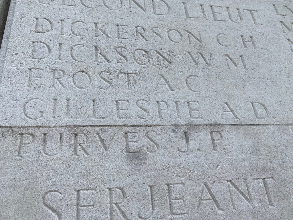 Equally impactful was the Loos Memorial which holds the inscription of A.D. Gillespie’s name. His name appears on one of the panels inside the enclosure under the Argyll and Sutherland listings for Lieutenants. His remains were never recovered but he was lost at the Battle of Loos in September to October, 1915. Seeing his name had a similar effect for me as did Vimy: AD Gillespie was a young, brilliant scholar and thinker who had such potential and whose life was taken so young. But what made seeing his name so special was to visit his marker on the route that he dreamed about in 1915, and to visit it over 100 years later with Tom, Alice, and Theo, descendants of AD’s sister and distant relatives to my family. I will be forever grateful to them for including me in this journey.