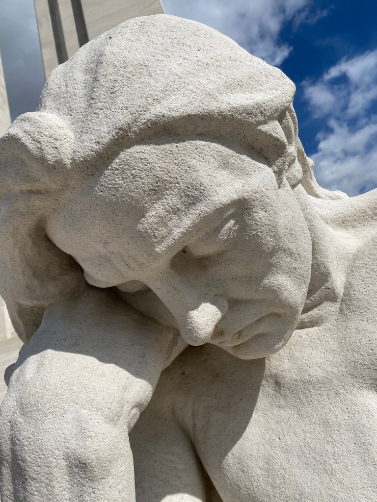 It’s hard not to catch a sob in your throat when you first lay eyes on the Vimy Ridge memorial. In fact I didn’t catch it in time and let out a few…. I don’t think it is a national pride thing for me. I was simply awestruck and moved I guess. The memorial has immense aesthetic beauty; it is a powerful work of art, and when you look at the expressions on the faces and the stance or repose of the sculpted figures, you simply cannot suppress the sadness of the thought of the terrifying-and in some cases fatal-experience the young men had who were far from home and away from families who loved them; being sent into such a horrific battle. Between 15-20,000 Canadians were involved in direct combat that day April 9, 1917. They had been huddling in the tunnels for 18 hours waiting for the artillery to stop and then sent out and “over the top.” They won on that particular day, but at considerable cost. 10,600 casualties, 3,600 of which were fatal.