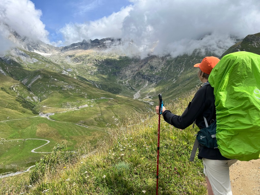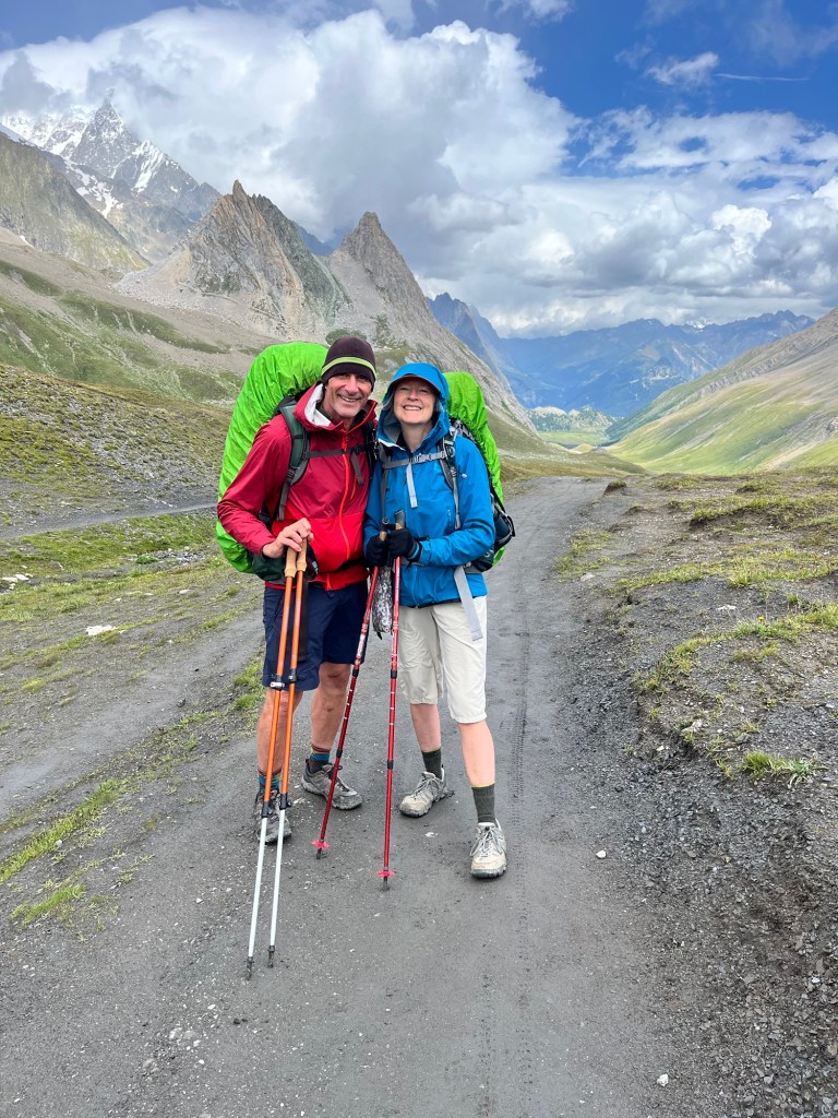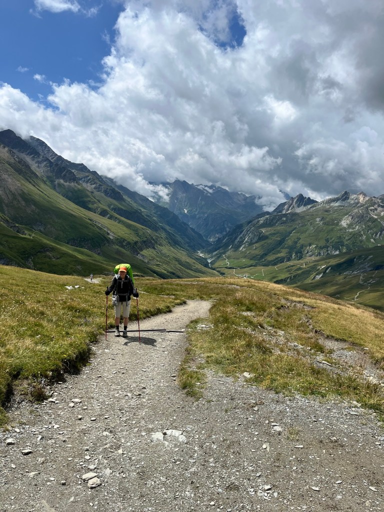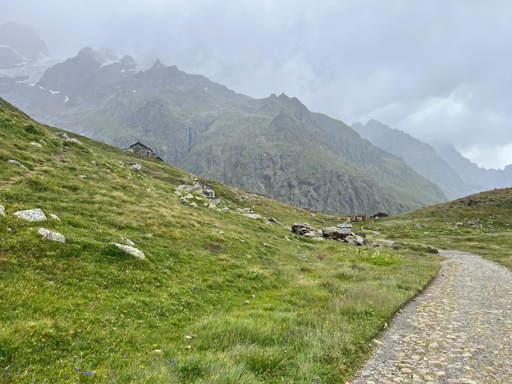 A spectacular day today with a slow steady climb swinging NE out of Les Chapieux up a steep sided valley through farmland and eventually a series of switchbacks, up up to the Col de la Seigne at 2518m elevation and the border between France and Italy. The weather was pretty much everything. Started out beautiful sun and patchy clouds, then started to cool and close in so that lunch was curtailed (how fast can you down a cheese and ham baguette?) again and the rest of the climb and descent was in intermittent wet blasts coming off the glaciers. But beautiful beyond description: glaciers peaking out from the clouds and mist scudding by. And dramatic. We are on the East side of the Mont Blanc glacier complex and the peaks are everywhere. Our descent to Rifugio Elisabetta was wet and cold, but we are booked in for the night in two hostel bunks and half board- dinner and tomorrow’s breakfast included. Hot showers at 2 Euros each. I’ve had a cappuccino and Ali a cup of tea. We are warm, dry, tired, inspired… ready for a pre dinner nap.