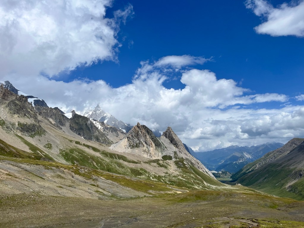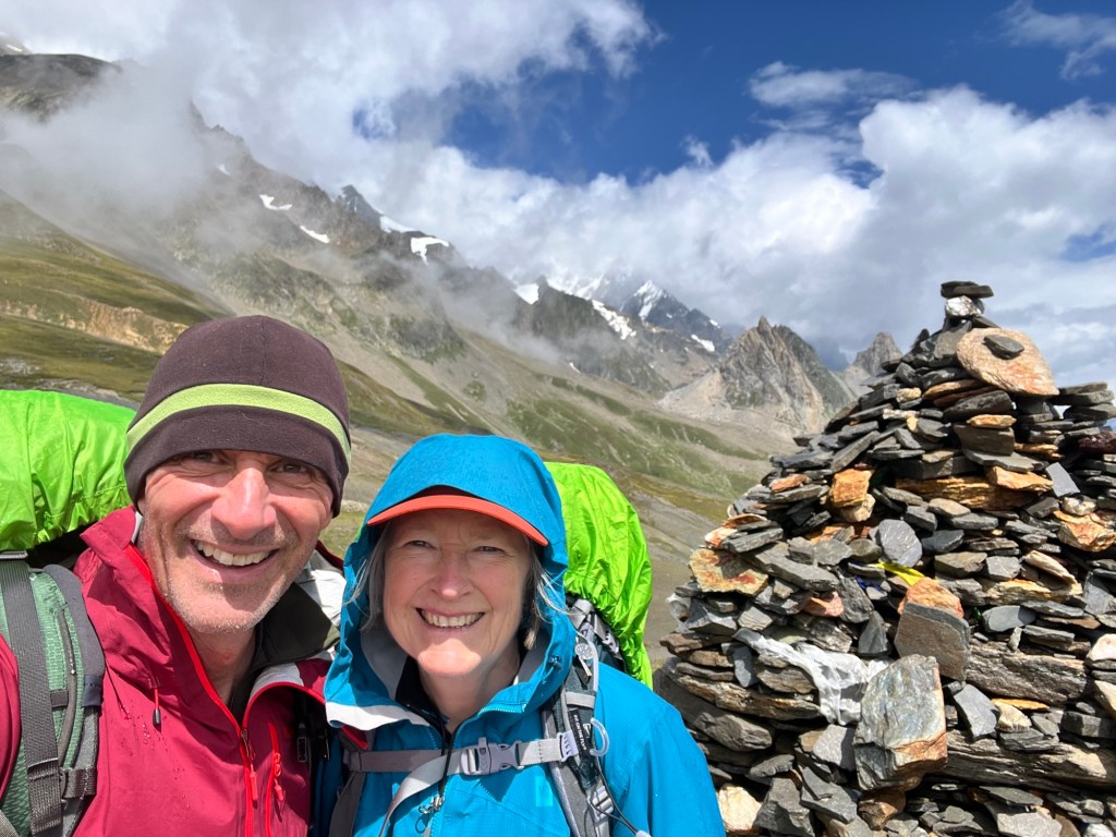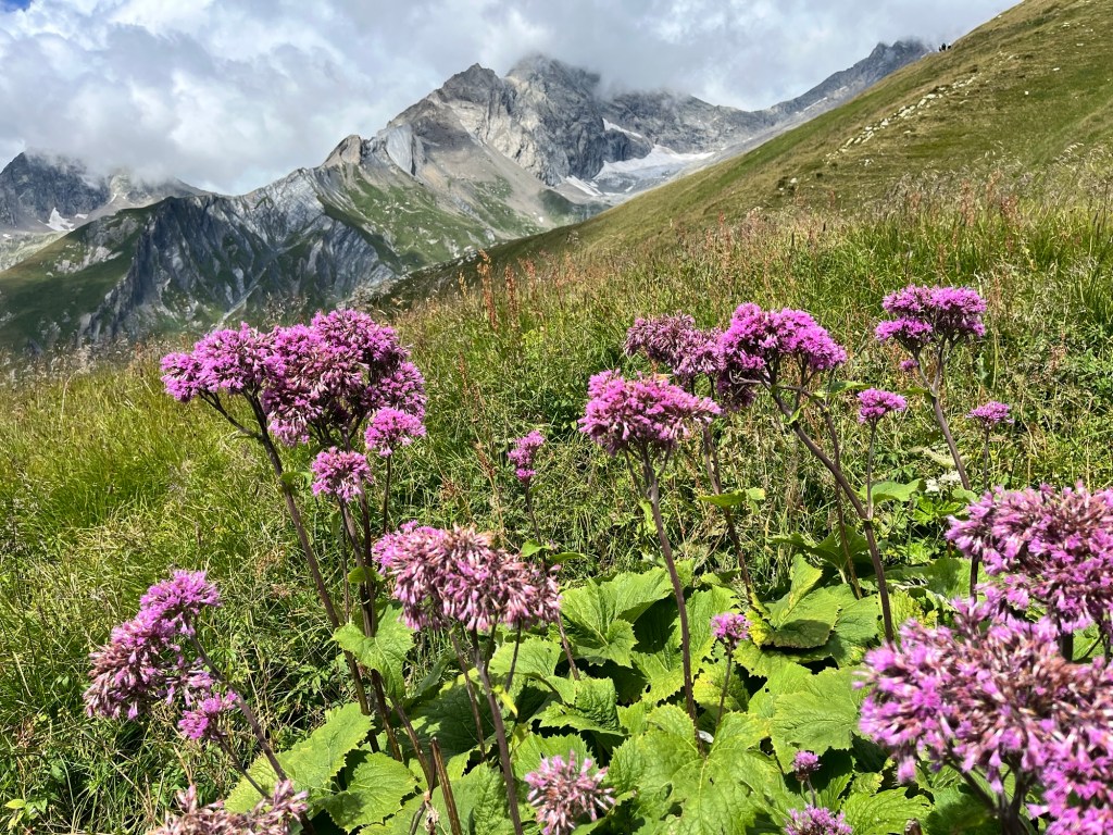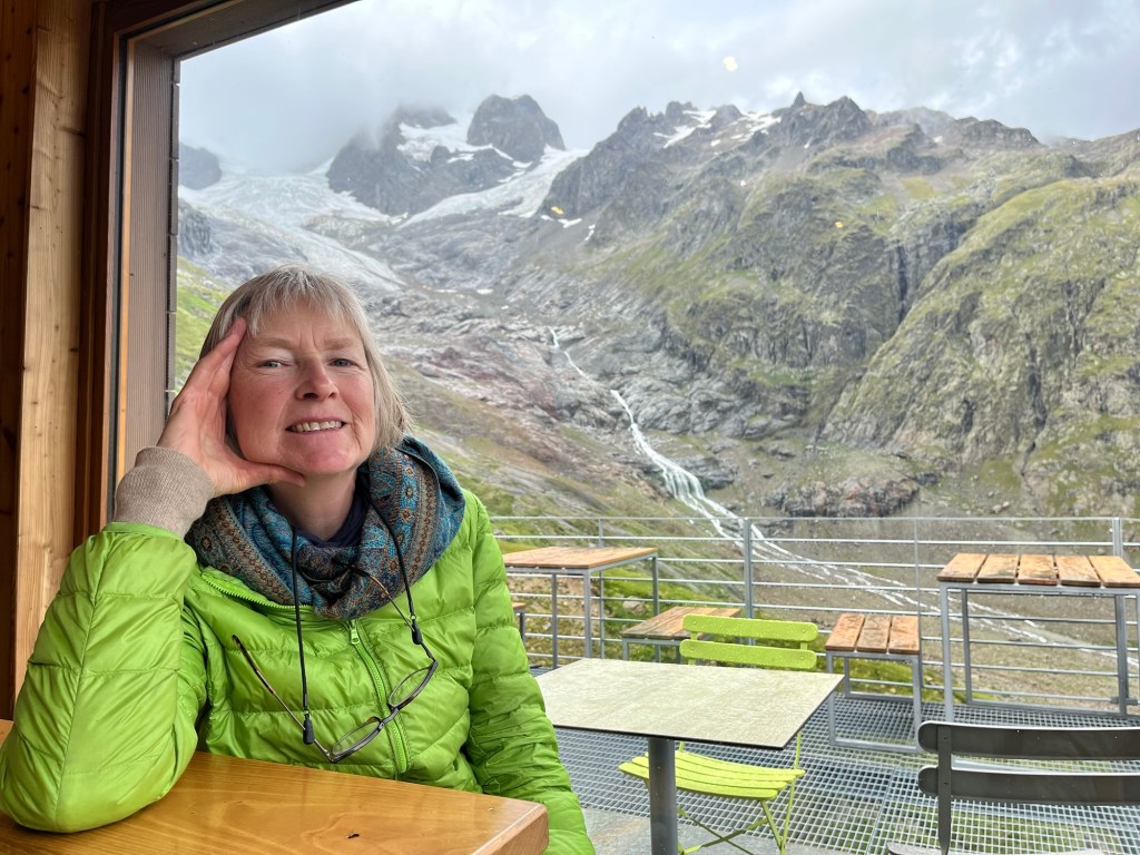 A spectacular day today with a slow steady climb swinging NE out of Les Chapieux up a steep sided valley through farmland and eventually a series of switchbacks, up up to the Col de la Seigne at 2518m elevation and the border between France and Italy. The weather was pretty much everything. Started out beautiful sun and patchy clouds, then started to cool and close in so that lunch was curtailed (how fast can you down a cheese and ham baguette?) again and the rest of the climb and descent was in intermittent wet blasts coming off the glaciers. But beautiful beyond description: glaciers peaking out from the clouds and mist scudding by. And dramatic. We are on the East side of the Mont Blanc glacier complex and the peaks are everywhere. Our descent to Rifugio Elisabetta was wet and cold, but we are booked in for the night in two hostel bunks and half board- dinner and tomorrow’s breakfast included. Hot showers at 2 Euros each. I’ve had a cappuccino and Ali a cup of tea. We are warm, dry, tired, inspired… ready for a pre dinner nap.