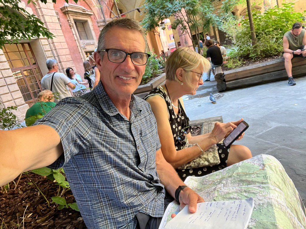 Ok back on wifi.. well we are very excited to have spent a lovely day in warmer temps and the beautiful medieval city of Bologna, Italy exploring and setting out our next walk. We took a longish bus ride to get here yesterday from Chamonix. And tomorrow we will set off early from the Piazza Maggiore on the Via degli Dei (Path of the Gods) walking route from Bologna to Florence through the Tuscan Emilian Appenines, and an ancient Roman road built in 187 BCE.