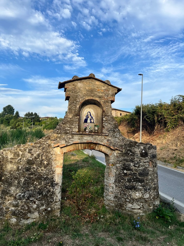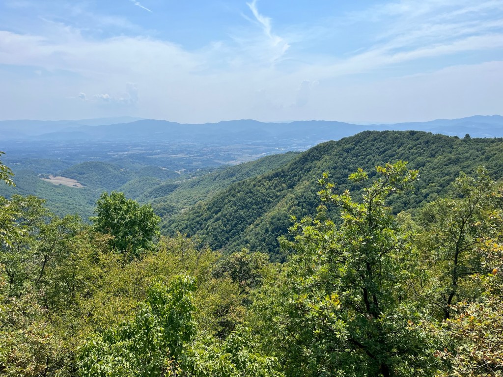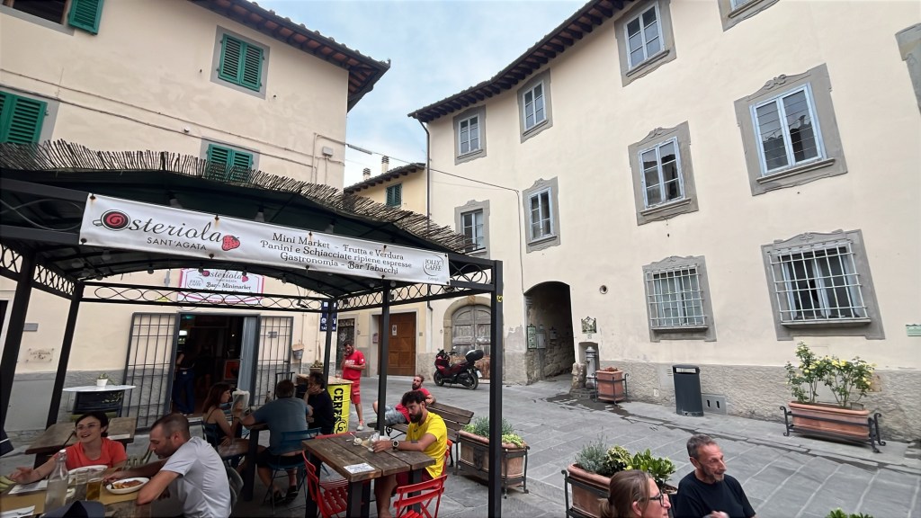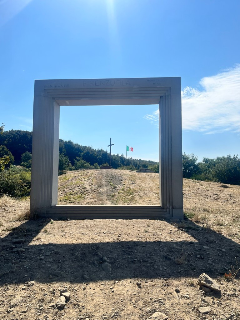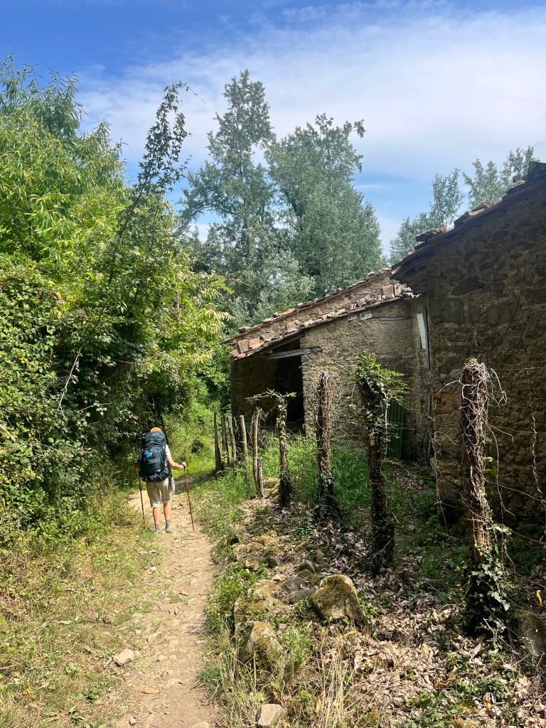 We started early yesterday from our campground at San Futa (noisy place!) and had breakfast of the last of the porridge we’ve been packing around since Switzerland (it’s too hard not to have a fresh croissant in the morning!). We walked back up to the Futa war cemetery and then a few kms of descent along a main road before leaving pavement and starting the climb through beech and conifer woods up to a pilgrimage cross (and interesting arch) marking a high point at Mont Gazzaro at about 1100m. From there most of the day was along a beautifully forested ridge line or just below through a pass at Osteria Dell Bruciata, more ridge walking and shady trail (so grateful for the shade!) till about km 16 on the day then a steepish descent toward Sant’ Agata for a total of 21. We were forewarned about the lack of water sources on this leg so “watered up” in the morning and were carrying a good 4L which ran out just we came into the little ancient church at Montepoli at about km 18. From there a simple walk along the road into the really charming town of Sant’Agata where we stayed at a very welcome hostel with comfy bunks and hot showers! We had a nice dinner of local pasta and vegetables at the only bar/ristorante/market/convenience store in town, in the centre “piazza” at the base of the large Romanesque era church (built in 948 AD) that marks the centre of town. Just amazing. The town was getting ready for the annual mid-August holiday “Ferragosto” celebrating a mid-summer break from work for Italians across the country.