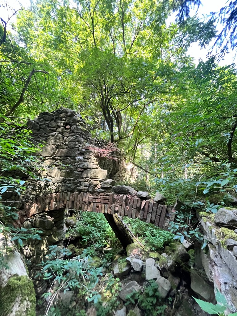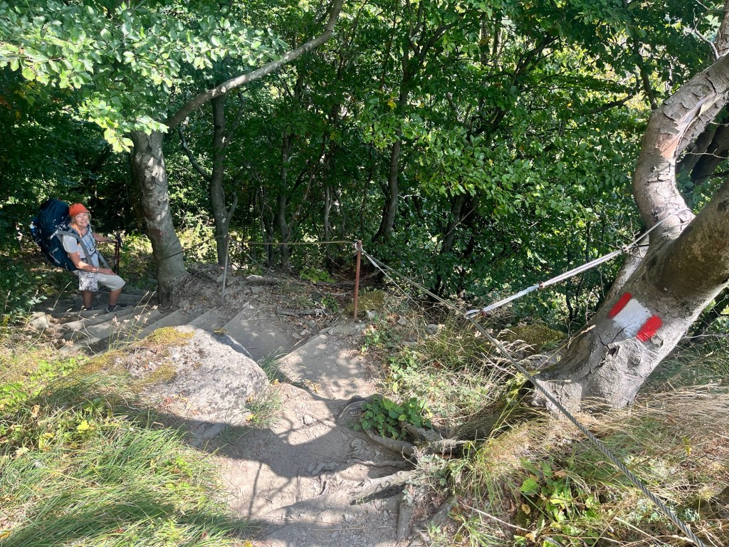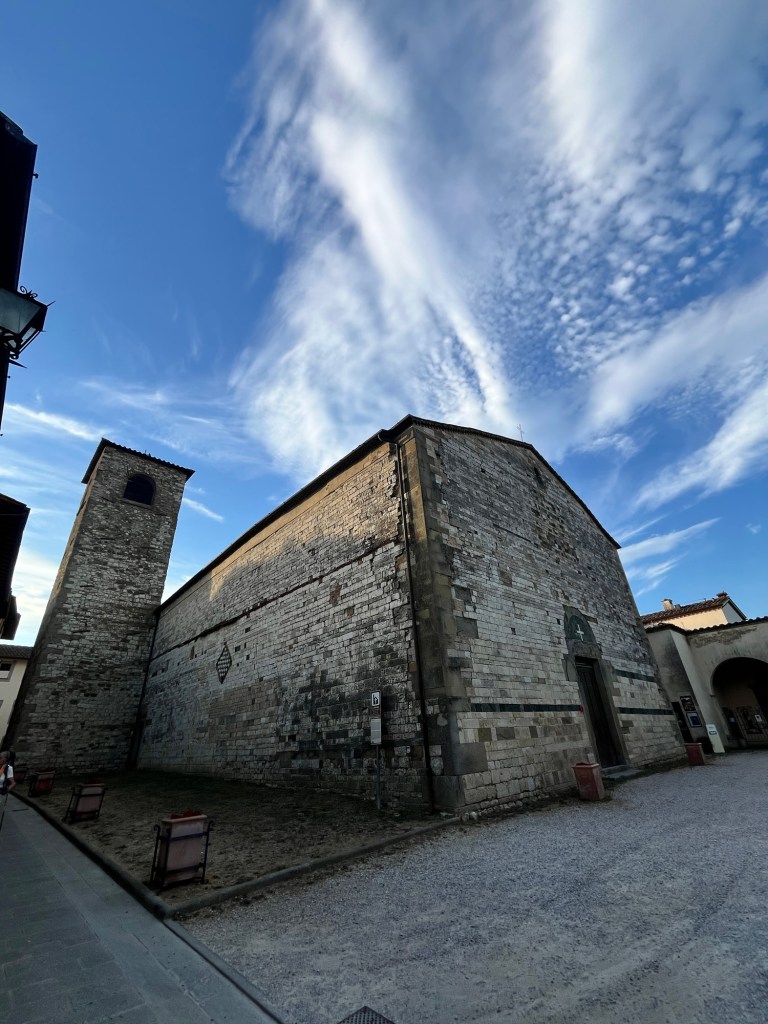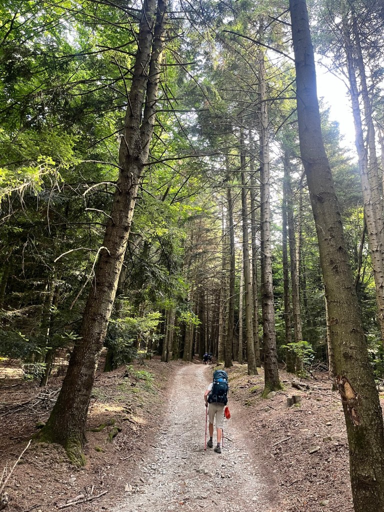 We started early yesterday from our campground at San Futa (noisy place!) and had breakfast of the last of the porridge we’ve been packing around since Switzerland (it’s too hard not to have a fresh croissant in the morning!). We walked back up to the Futa war cemetery and then a few kms of descent along a main road before leaving pavement and starting the climb through beech and conifer woods up to a pilgrimage cross (and interesting arch) marking a high point at Mont Gazzaro at about 1100m. From there most of the day was along a beautifully forested ridge line or just below through a pass at Osteria Dell Bruciata, more ridge walking and shady trail (so grateful for the shade!) till about km 16 on the day then a steepish descent toward Sant’ Agata for a total of 21. We were forewarned about the lack of water sources on this leg so “watered up” in the morning and were carrying a good 4L which ran out just we came into the little ancient church at Montepoli at about km 18. From there a simple walk along the road into the really charming town of Sant’Agata where we stayed at a very welcome hostel with comfy bunks and hot showers! We had a nice dinner of local pasta and vegetables at the only bar/ristorante/market/convenience store in town, in the centre “piazza” at the base of the large Romanesque era church (built in 948 AD) that marks the centre of town. Just amazing. The town was getting ready for the annual mid-August holiday “Ferragosto” celebrating a mid-summer break from work for Italians across the country.