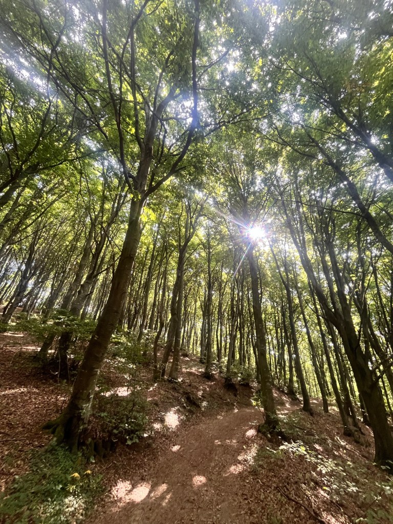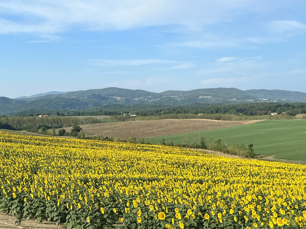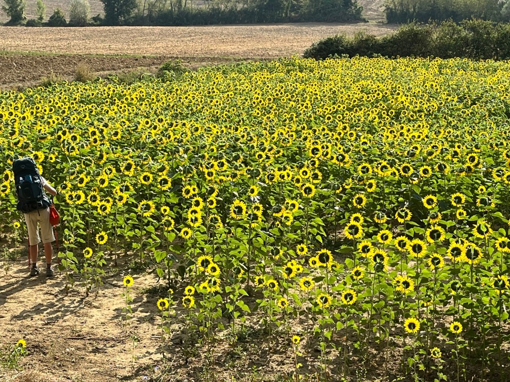 You both look so fit, healthy and happy! Love your commentary and the photos. Highlights for me in this post are the sunflowers (stunning!) the archway in the woods, the trees (I had to google coppice) and open meadows (such vast space) and walking into a small village and being able to find a yummy authentic pasta meal! I meant to comment about the ancient stone roads in the previous post. Remarkable workmanship. I am also struck by how clean and tidy the villages are. Sending you both big hugs and hopes for a bit cooler temps for you.