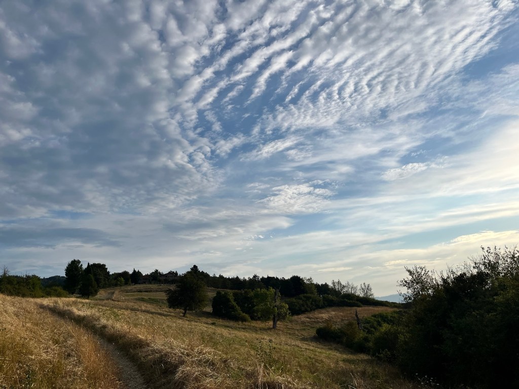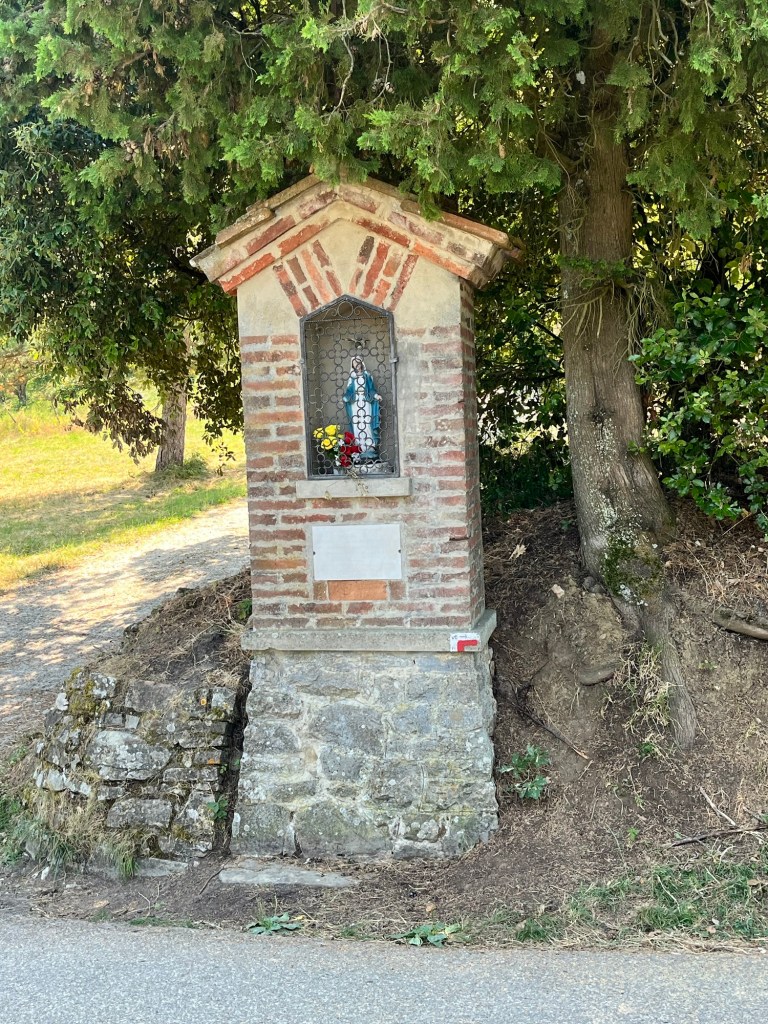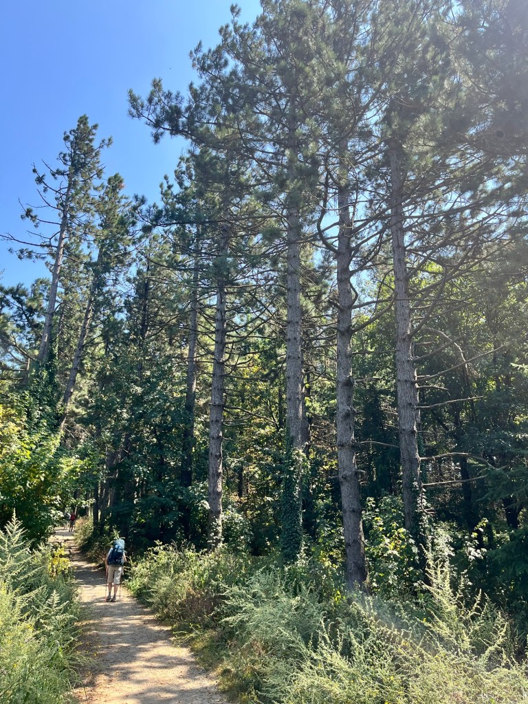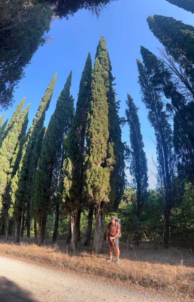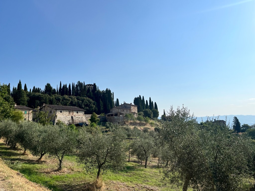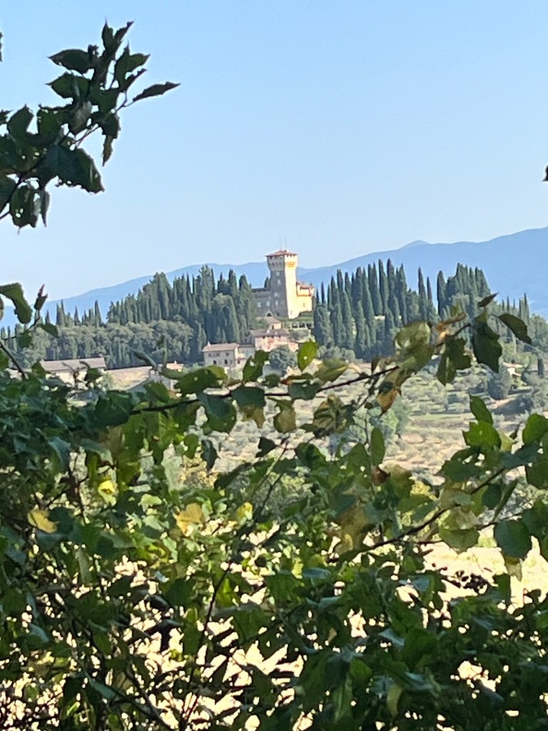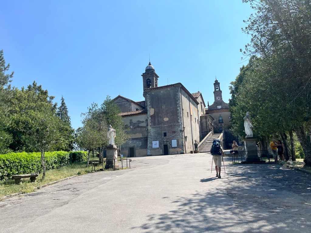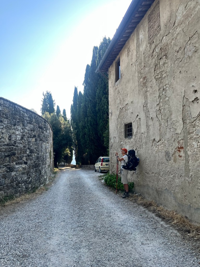 Starting early from our campsite at San Piero a Sieve we started climbing almost immediately through a picturesque lane lined with Italian cypress trees up to the Trebbio Castle, a UNESCO heritage walled castle of the Medici family, one of the founding and ruling families of Florence, Tuscany and leaders of the renaissance movement in Italian art and science in the 15th century. Tours were not open, so we wandered along the trail through the compound then out into the rolling olive groves still operating and growing heritage olives. Then up and up still through oak, pine, and juniper Southeast for what seemed a very hot steady climb 🥵 (894m) to the old Convento di Monte Senario for a much needed rest in the shade and popsicle at the little store. From there, down to the main road and to our wonderful B and B run by Lucia in her house near Bivigliano where we had a cold shower, nap and amazing family style meal with other hikers, all Italian. Not much English spoken, but a lot of fun and great food! 19.5 kms