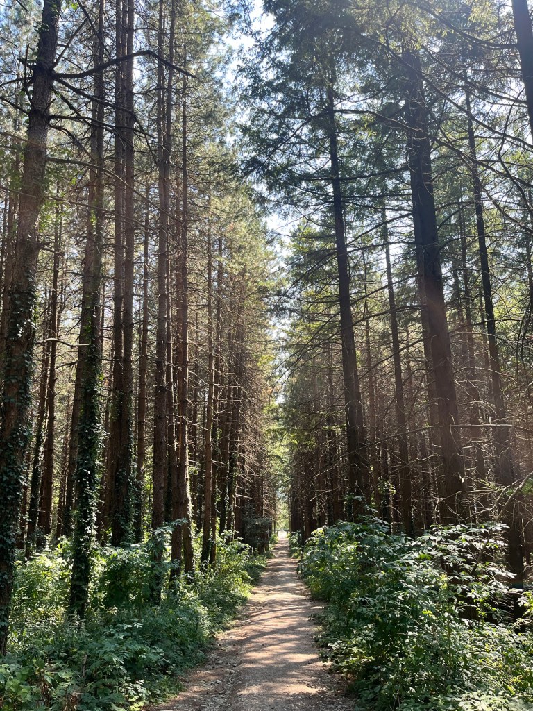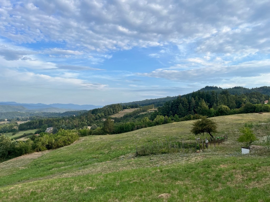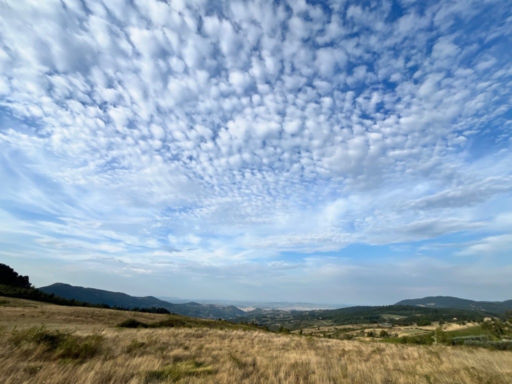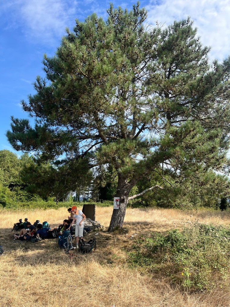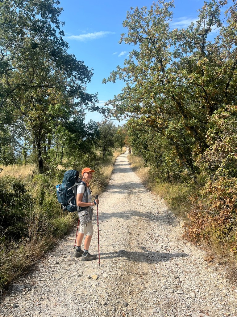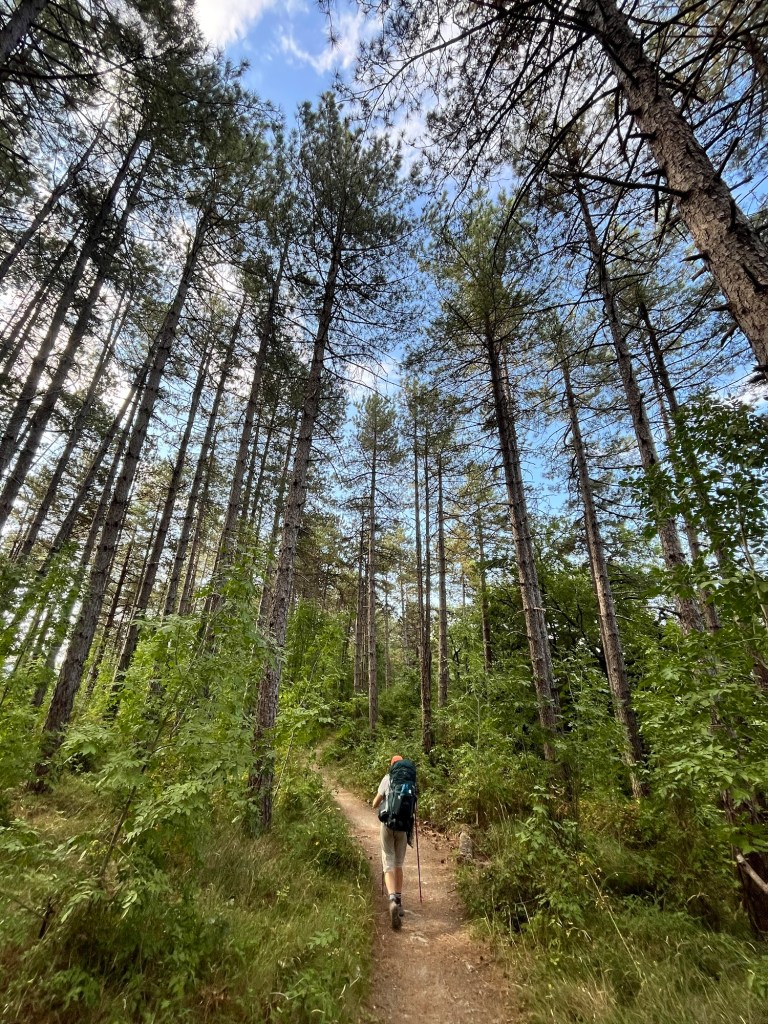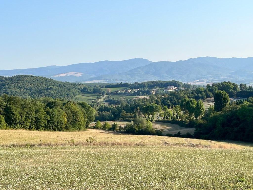Starting early from our campsite at San Piero a Sieve we started climbing almost immediately through a picturesque lane lined with Italian cypress trees up to the Trebbio Castle, a UNESCO heritage walled castle of the Medici family, one of the founding and ruling families of Florence, Tuscany and leaders of the renaissance movement in Italian art and science in the 15th century. Tours were not open, so we wandered along the trail through the compound then out into the rolling olive groves still operating and growing heritage olives. Then up and up still through oak, pine, and juniper Southeast for what seemed a very hot steady climb 🥵 (894m) to the old Convento di Monte Senario for a much needed rest in the shade and popsicle at the little store. From there, down to the main road and to our wonderful B and B run by Lucia in her house near Bivigliano where we had a cold shower, nap and amazing family style meal with other hikers, all Italian. Not much English spoken, but a lot of fun and great food! 19.5 kms