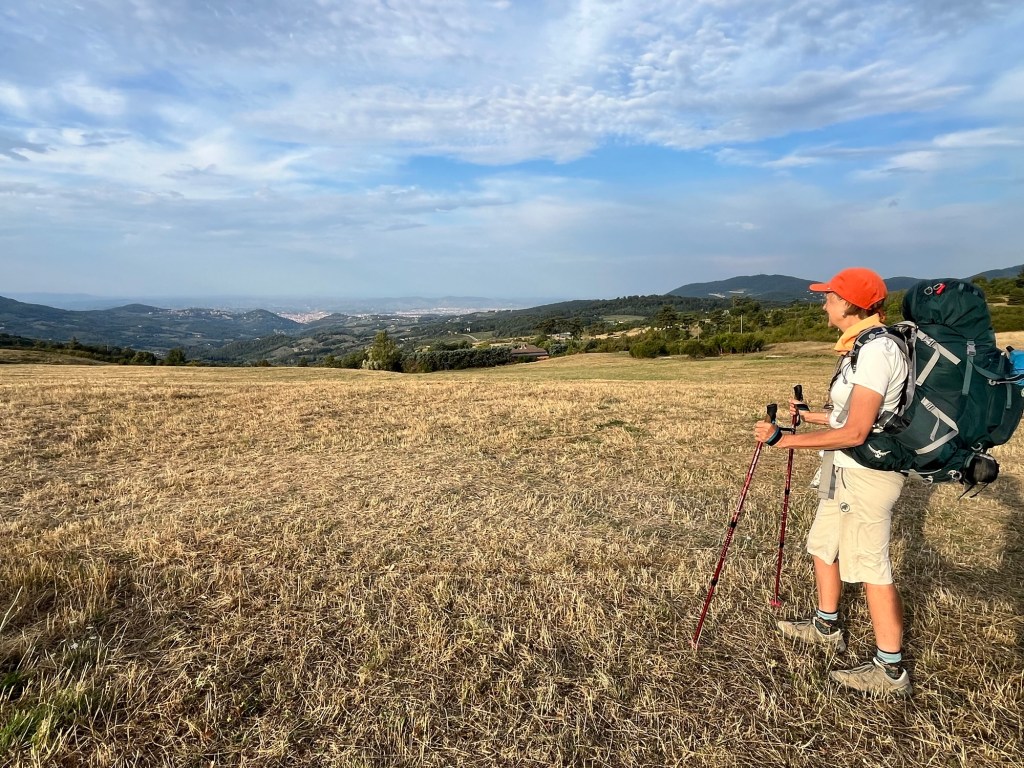 Today we started early from the hostel and walked down the paved road then out across fields toward Fiesole. Today was the first day that Florence hove into view. It looks beautiful from a distance with the massive dome of the Florence Cathedral marking the skyline. We walked over the high point at Monte Fanna and the down the trail and secondary road into Fiesole where are camped at a nice campground for the night. 14 kms. We had time to do a laundry! Onto Florence and trails end tomorrow!
