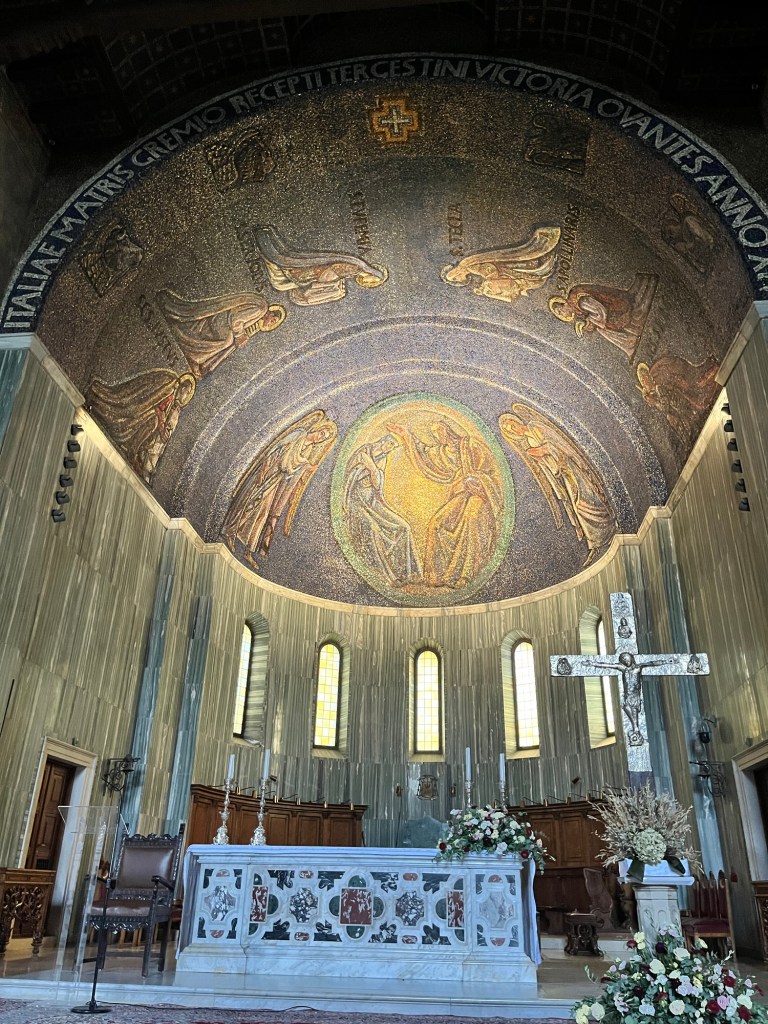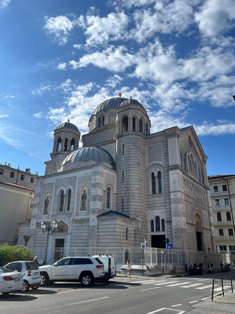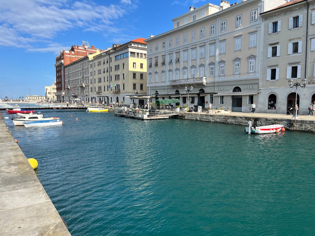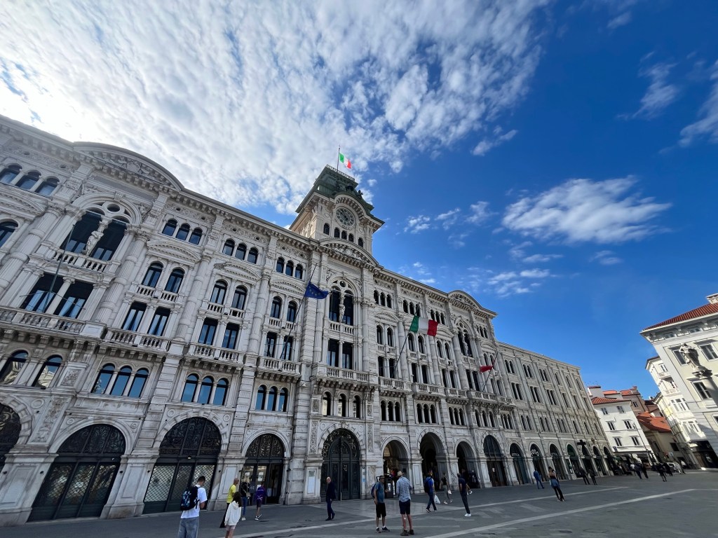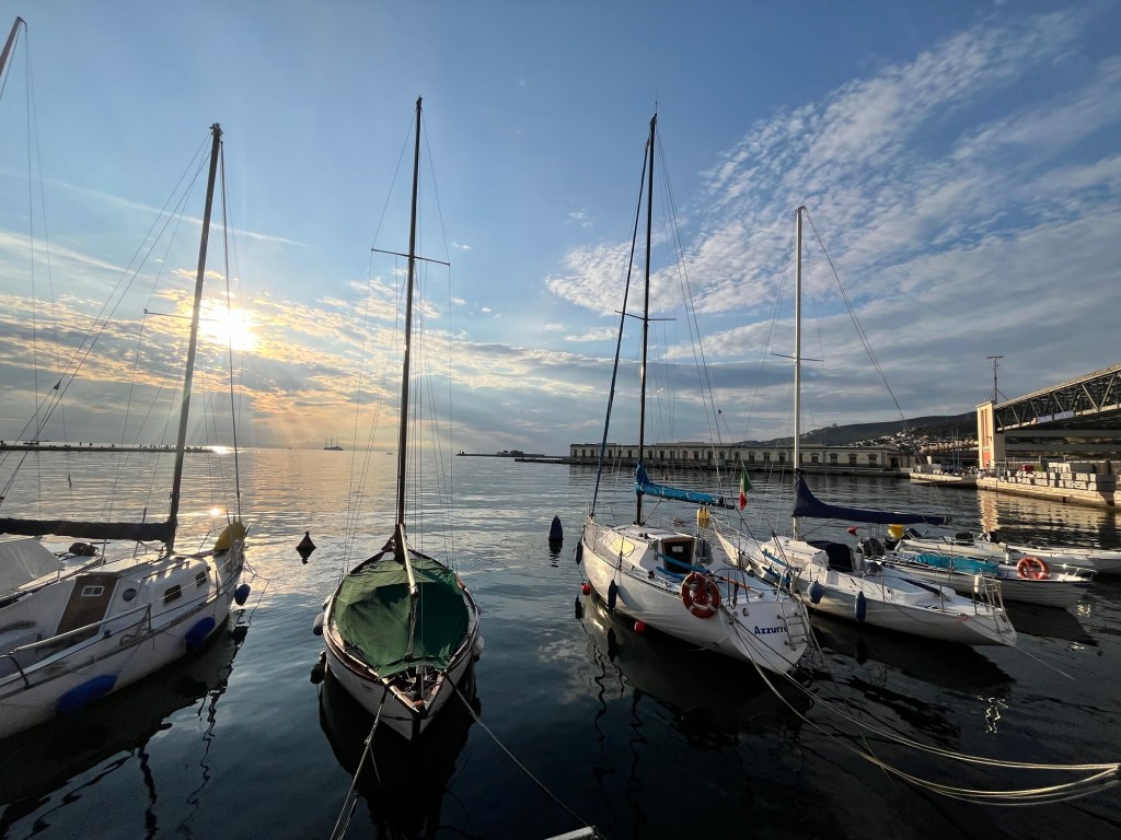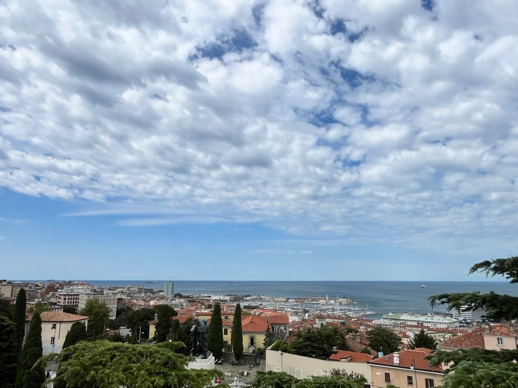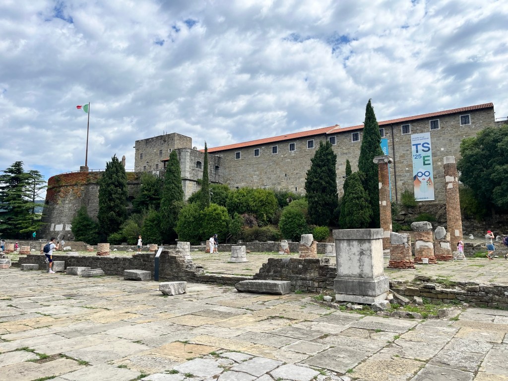 Quick post: Leaving Trieste today after a short two night stop over. We had a lovely visit and dinner invitation with Christabel (Mike B’s cousin) and Roberto and a day of sightseeing through the old part of the city and the Castello di San Giusto built for Austrian governors and royalty in stages from 1468 to 1636. That part of the city also has the remains of a Roman amphitheater and the castle exhibits archaeological finds from Roman and Byzantine antiquity. Not enough time to fully absorb, but a city with a very interesting history and historical importance right up to the post war era.