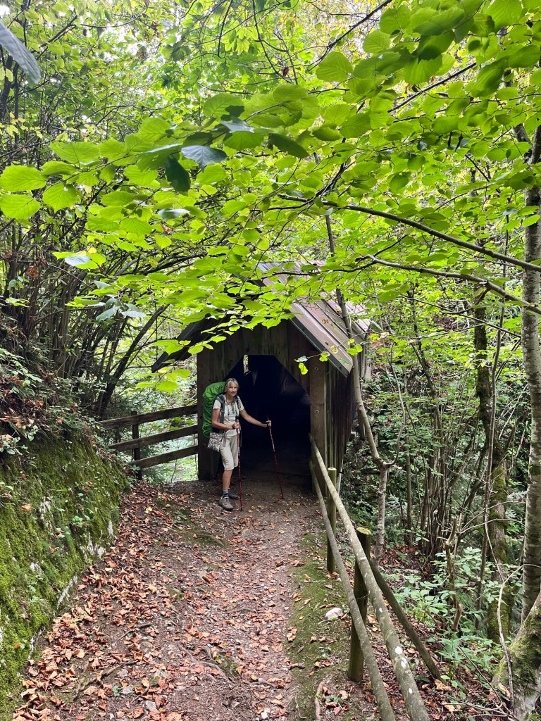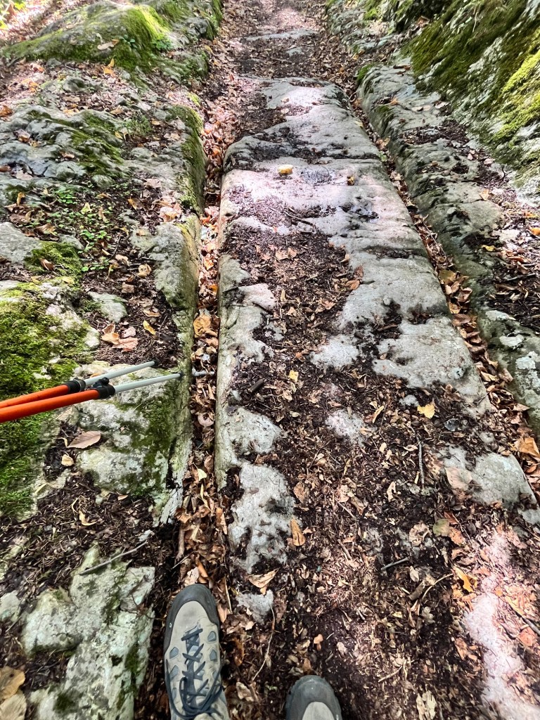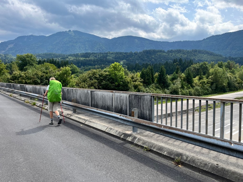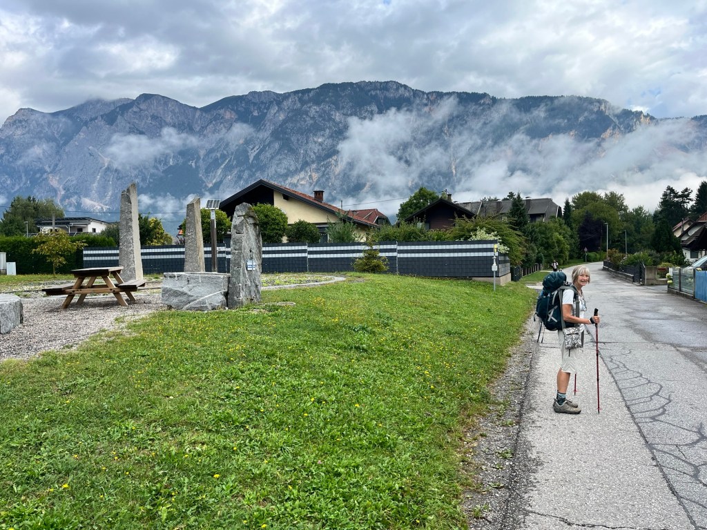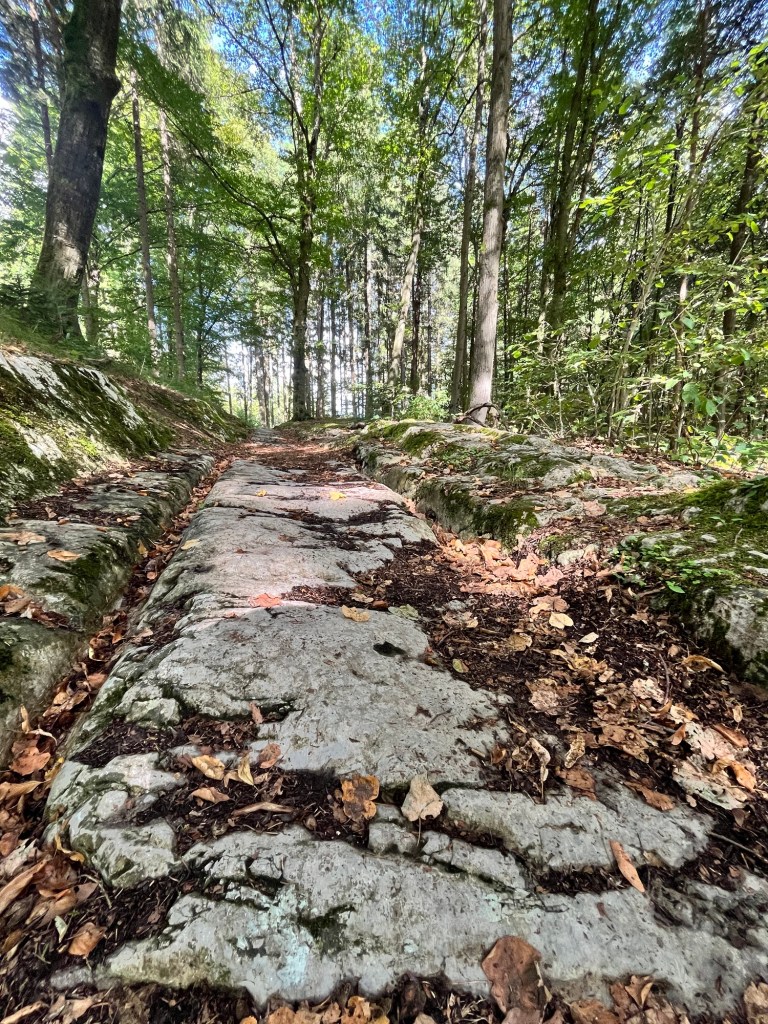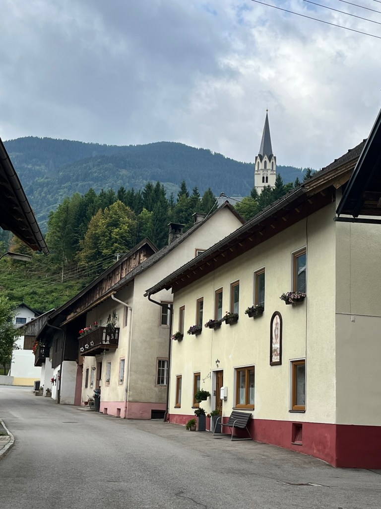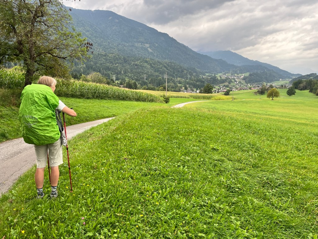 Today was stage 4 of the walk where, after a visit to an apotheke (pharmacy) to restock depleted supplies of ibuprofen and tylenol 🤓we walked North out of Arnoldstein crossed the Gail River back to the North side and then enjoyed a very gentle (but long) walk along the river at times then through more forests and through the towns of Oberschütt and Unterschütt. One area of the forest was quite different in vegetation and with scrub trees growing amongst scattered and very old large boulders. The story goes that there was a landslide here from far up on the mountainside that came down and destroyed a town – in 1348. The only structure to survive was the church! After a few kms back along the Gail we headed north again up through a low forested pass with another and longer section of Roman road carved out of the limestone. Centuries of wheel ruts still visible! The road linked Carinthia to Italy two millennia ago… very interesting story about the “Knights of Ras” who made trouble in the area in the Middle Ages and had to be banished by the bishop, but you’ll have to google it 😆. Anyway lots to see and read about on the walk including examples of ancient biodiverse protected meadows still intact and kept separate from grazing.