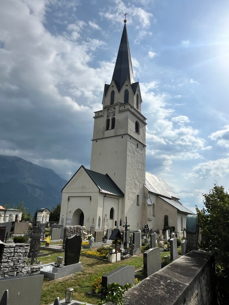Yesterday we left our B&B in Nötsch and walked down to the Gail river crossing it at the highway and then in to the streets of the smaller farm village of Feistritz an der Gail. In fact, stage 3 of the walk yesterday was very much a village to village walk that included Goriach, Draschitz, Hohenthurn, and then into Arnoldstein by the late afternoon. Mostly level walking on pavement or nice trail meant a fairly leisurely pace and time to take pictures (a number of pretty churches) and take a few breaks along the way. At each town the route took us through the town square or through a churchyard with barns and farm courtyards along the lanes. Just very picturesque. Arrived into Arnoldstein (a larger town with more of a mining history) in time to rest the feet before searching for dinner.