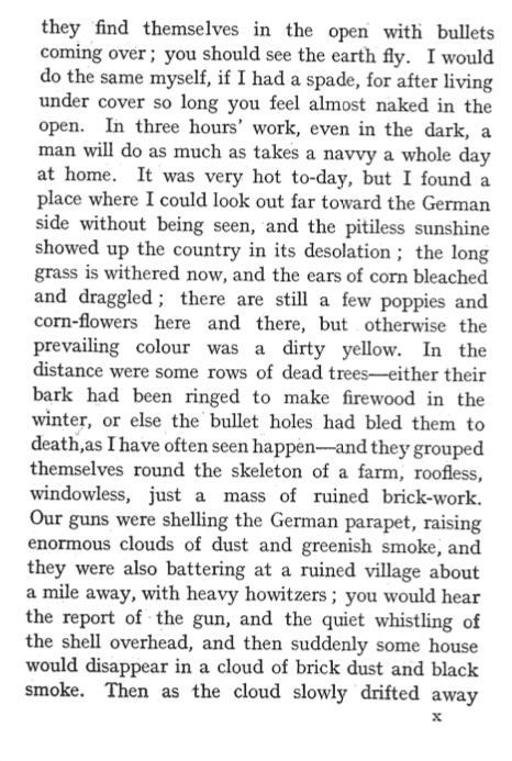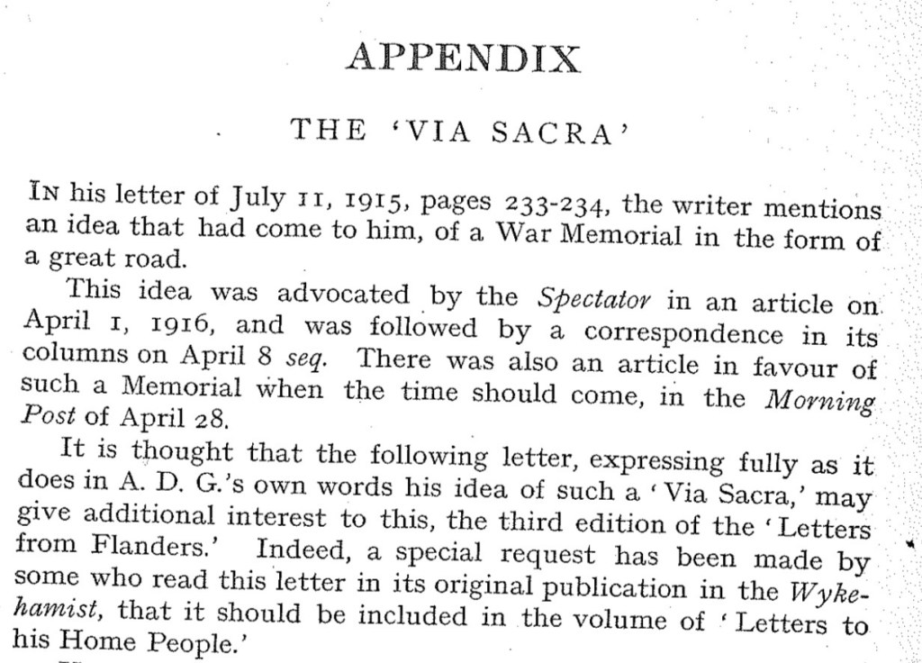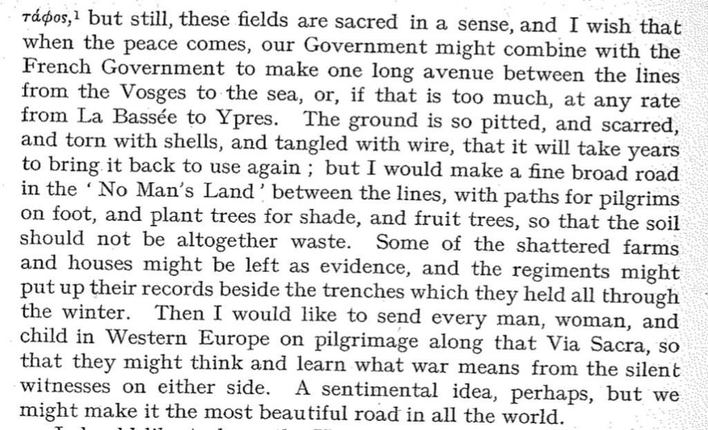 “..when peace comes, our government might combine with the French government to make one long avenue between the lines from the Vosgues to the sea… I would make a fine broad road in the “no-mans land” between the lines with paths for pilgrims on foot and plant trees for shade and fruit trees, so that the soil should not altogether be a waste. Then I would like to send every man, woman, and child in Western Europe on a pilgrimage along the Via Sacra so that they might think and learn what war means from the silent witnesses on either side..”