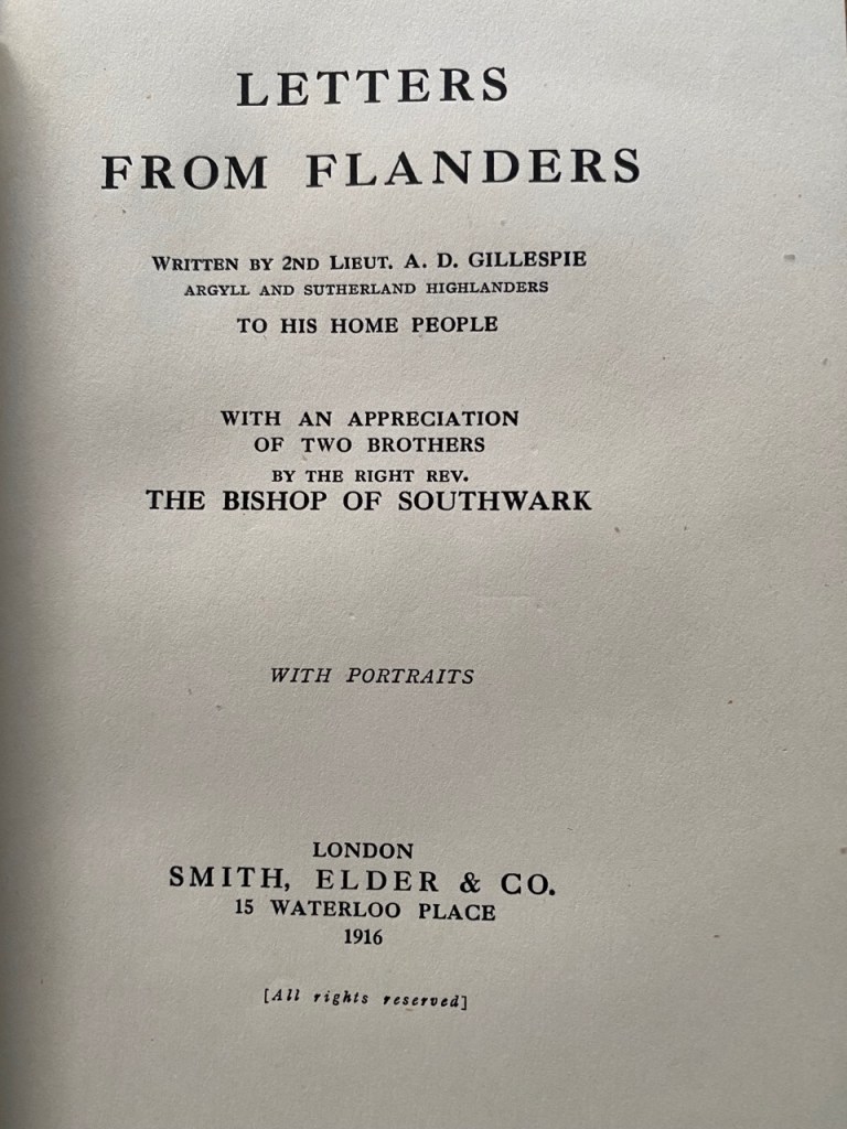 When my Mum passed away in 2001, one of the family heirloom books passed on to me for safe keeping was a copy of “Letters from Flanders” by A.D. Gillespie published posthumously in 1916. It is a collection of correspondence to his parents beginning with letters from his various training camps in July/August 1914 (that express hopes for peaceful resolution before hostilities were to break out) right through to just before his tragic death in the trenches in September 1915. The book also contains an Appendix with a longer description Douglas’ idea for a Via Sacra (Sacred Road).