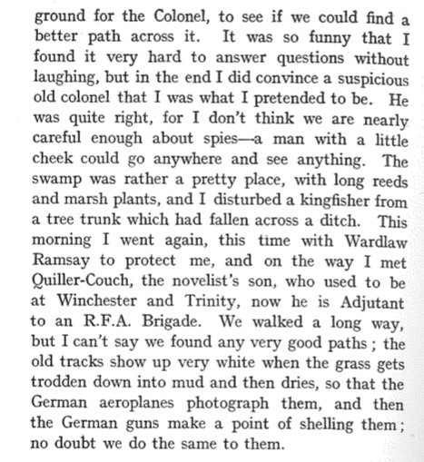 A excerpt from A.D.’s letters from September 15, 1915…. The previous page of this screen capture starts: “ Yesterday I was nearly arrested as a spy, while making a reconnaissance of some swampy….
